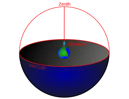 - The zenith is the point in the sky directly overhead. It is necessarily true that any point on the horizon is 90° from the zenith.