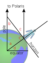 which means that the angle between the pole and the horizon is the same as the observer's latitude. This fact was once used by navigators at sea, who could easily find their latitude by measuring the position of Polaris.