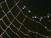 When water drops are on an impermeable (waterproof) surface, they tend to form beads. This is due to its surface tension. Liquid molecules pull at each other, and as a result they decrease their surface area. The molecules at the boundary of the liquid are pulled in, causing a droplet shape. When water is on a permeable surface, it spreads out, as can be seen with water on a paper towel. This capillary action explains how water in the ground reaches the top of trees that are hundreds of feet tall.