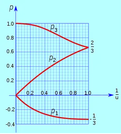 Figure 1 is a plot of p1, p2, p3 with an argument 1/u. The numbers p1(u) and p3(u) are monotonously increasing while p2(u) is monotonously decreasing function of the parameter u.