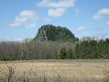 Roche-A-Cri can be seen from a few miles away when approaching on local road way. The relatively flat topography allows this mound to be seen from a distance however, when you are near the mound older forest growth that surrounds the state park somewhat shields the view of the immense hill. Either entering the park at its main entrance or at the winter season parking areas are the ways to get close up views of the flat rock faces of Roche-A-Cri.[1]