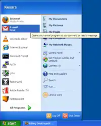 Screen shot showing Gmail as default e-mail program on Windows Start Menu.