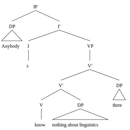 (6b) *Anybody knows nothing about linguistics there.