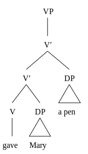 Treating complements as adjuncts or VPs as ternary branching structures are not without problems. While ternary branching works somewhat for examples like (1b), both fail at verbs VP + NP + NP constructions like (1a), as we will demonstrate here. However, before we proceed, we need to look at the concept of c-command.