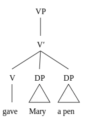 In light of the evidence above, a new structure for double-object constructions has been introduced, in which the verb originates between the two objects and moves to the front (the structure for VP + NP + NP constructions is actually slightly more complicated than has been shown here, but we're not in a position to reveal the whole story):