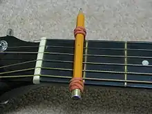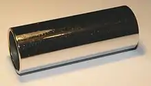 A slide or bottleneck is a ceramic, glass or metal cylinder, usually worn on the fingers rather than held in the hand. The term slide is in reference to the sliding motion of the slide against the strings, while bottleneck refers to the original material of choice for such slides, which were the necks of glass bottles.