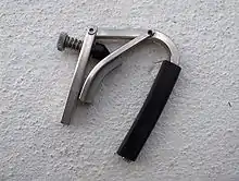 A capo (short for capotasto, which is Italian for "head of fretboard") is a device used for shortening the strings, and hence raising the pitch of the guitar. Capos are used to change the key and pitch of a guitar sound without having to adjust the strings with the tuning keys. It was invented by the Flamenco guitarist Jose Patino Gonzalez.