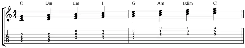 The guitar exercise below will allow you to quickly learn the chords of the C Major scale. For the Dm triad and Bdim triad use your little finger for the lowest note and for the lowest note of the last triad (C major octave) use your third finger.