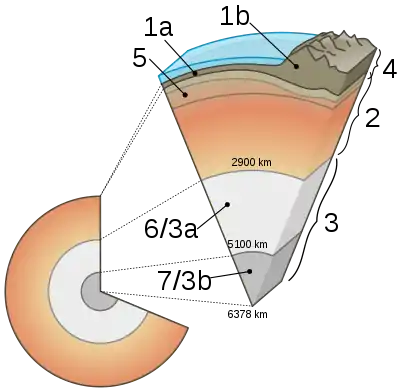 | Core (Fe and Ni) (3) | Liquid outer core (6) | 4600km |