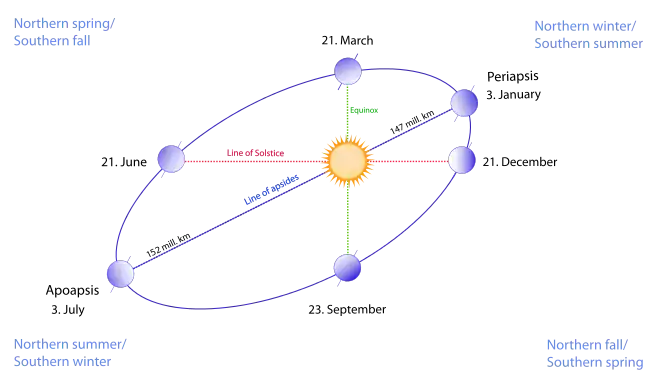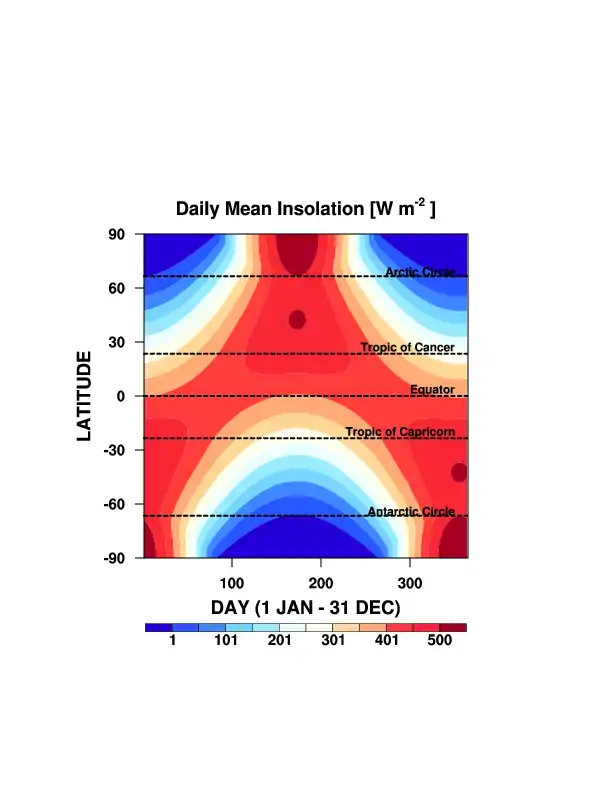 However, this difference in temperature varies with season because of the tilt of the earth's axis (at around 23.5°). When the earth revolves around, different areas will receive the largest angle of the sun: