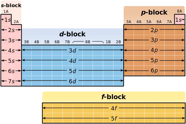 The main group elements are actually in two groups: the s block and the p block. These two, let's call them sub groups, are separated in the Periodic Table by a special group of highly colorful compounds known as the transition metals. The transition metals represent groups 1B through 8B of the diagram below and are formed as electrons are filling in the d orbitals. This is why they are referred to as the d block. We will look at all of this in the lesson that follows.