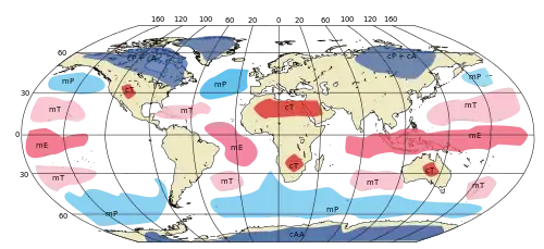 Globally, the major air masses are continental arctic or continental antarctic (cA or cAA); continental polar (cP); maritime polar (mP); continental tropical (cT); maritime tropical (mT); and maritime equatorial (mE). Maritime arctic and continental equatorial air masses rarely form.