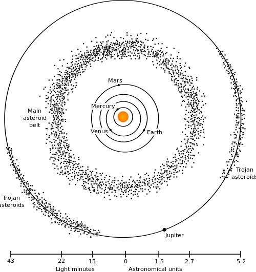 About 100 million years after the formation of the Sun, the gravity of the planets and moons in our solar system had swept up most of the planetesimals. However, millions of these objects still remain in gravitationally stable orbits in the main asteroid belt of the solar system, in the Trojan asteroid belt, or out beyond Neptune and Pluto in the Kuiper belt. Illustrated in the sketch below is the location of the largest reservoir of asteroids in our solar system today (Figure 12.10).