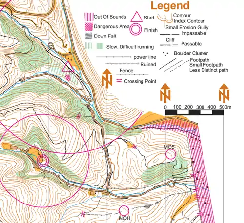 Look for the legend on the top left side of the map. It explains how this map records different features and shows what the marks on the maps represent. You can see the following: