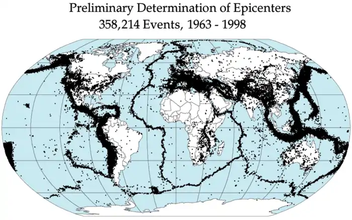 Some locations are prone to earthquakes and some are not. Nearly 95% of all earthquakes take place along one of the three types of plate boundaries. Scientists use the location of earthquake epicenters to draw the boundaries of the plates because earthquakes frequently occur along plate boundaries (Figure 7.27).