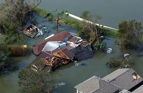The most recent catastrophic flooding in United States history occurred in New Orleans in 2005, in the aftermath of Hurricane Katrina (Figure 13.18). This flooding occurred because of the failure of the city's levees, raised structures designed to hold back a river or lake. The New Orleans levees were poorly designed, and broke in multiple places after the storm, allowing water to pour into the city (Figure 13.19). Ultimately, over 80% of the city was submerged, 90% of city residents evacuated, and over 1800 people died in the disaster.