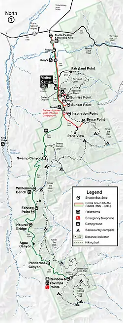 Now look at the corresponding section of the Visitor's map (Figure 2.27). You can see a green line which is the main road. The black dotted lines are trails. You see some markers for campsites, a picnic area, and a shuttle bus stop. But nothing on the map shows the height of the terrain. Where are the hills and valleys located? How high are the canyon walls? Which way will streams or rivers flow?