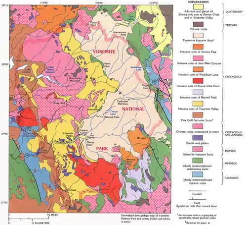 A geologic map shows the geological features of a region. Rock units are shown in a color identified in a key. On the map of Yosemite, for example, volcanic rocks are brown, the Tuolumne Intrusive Suite is peach and the metamorphosed sedimentary rocks are green. Structural features, for example folds and faults, are also shown on a geologic map. The area around Mt. Dana on the east central side of the map has fault lines.