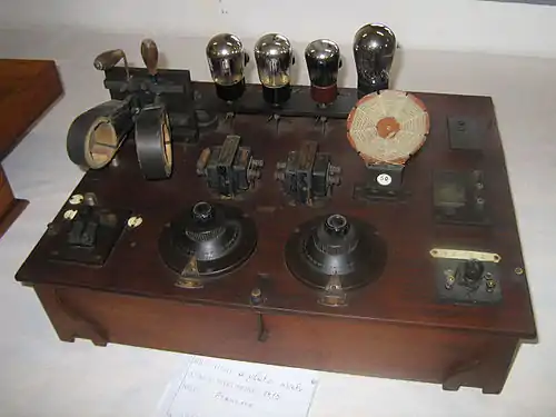 The technology that was eventually successful at transmitting and receiving sound over radio was the vacuum tube. This technology eventually enabled a whole host of electronic developments including radar, computers, and television. The triode vacuum tube was patented in 1906 by Lee De Forest (1873–1961). Throughout the 1910s, several corporate research labs, including those of GE and the AT&T Bell System, worked to improve the triode, and it quickly became the basis of radio transmitters and receivers. Figure 25 shows an early radio receiver implemented with vacuum tubes.