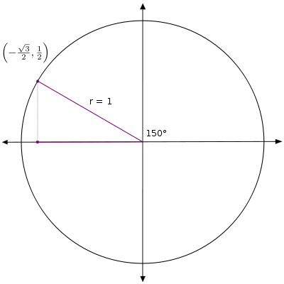 - Sketch the angle 150° on the unit circle. How is this angle related to 30°? What do you think the ordered pair is?