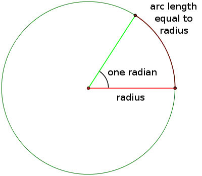 Angles can be measured in degrees or radians. A radian is the angle defined by an arc length equal to the radius length bent around the circle. One complete rotation around a circle, or 360° is equal to 2π radians. To convert from degrees to radians you use the following formula: