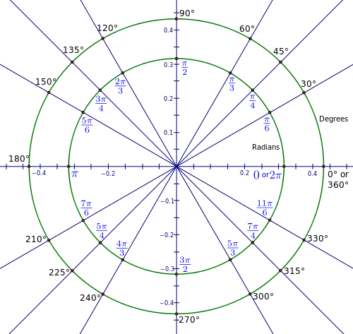 - The drawing shows all the quadrant angles as well as those with reference angles of 30°, 45°, and 60°. On the inner circle, label all angles with their radian measure in terms of π and on the outer circle, label all the angles with their degree measure.