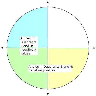 In this right triangle, x and y are the lengths of the legs of the triangle, which must have lengths less than 1, the length of the hypotenuse. Therefore, the ranges of the sine and cosine function do not include values greater than one. The ranges do, however, contain negative values. Any angle whose terminal side is in the third or fourth quadrant will have a negative y−coordinate, and any angle whose terminal side is in the second or third quadrant will have a negative x−coordinate.