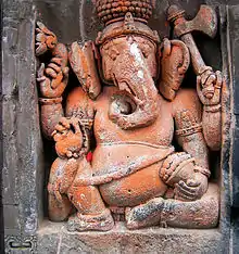 In Hinduism, the two symbols represent the two forms of the creator god Brahma: facing right it represents the evolution of the universe (Devanagari: प्रवृत्ति, Pravritti), facing left it represents the involution of the universe (Devanagari: निवृत्ति, Nivritti). It is also seen as pointing in all four directions (north, east, south and west) and thus signifies a grounded stability. Its use as a Sun symbol can first be seen in its representation of the god Surya (Devanagari: सूर्य, Sun). The swastika is considered extremely holy and auspicious by all Hindus, and is regularly used to decorate items related to Hindu culture. It is used in all Hindu yantras (Devanagari: यंत्र) and religious designs. Throughout the subcontinent of India, it can be seen on the sides of temples, religious scriptures, gift items, and letterheads. The Hindu deity Ganesh (Devanagari: गणेश) is often shown sitting on a lotus flower on a bed of swastikas. Swastika also means "well being".