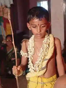 The Yajnopavita (sacred thread) is given to male Hindus to signify their spiritual awakening and acceptance as religious students. The ritual is usually reserved for males from the brahmin (priest) caste, the Kshatriya (military or ruler) caste and the Vaisya (merchant-traders) caste. The sacred thread is actually three intertwined threads symbolic of the Trimurti. The threads also represents three of the Vedas texts- the Rigveda, Samaveda and Yagurveda. The Artharaveda is not included. The knot in the middle of the sacred thread represents the eternal and divine force of all creation (Brahman). The thread is never meant to be taken off and a devout Hindu will bathe or swim with it on. It is hung diagonally from the left shoulder to the waist. It is placed over the right shoulder during funerals. The material of the thread may be cotton or wool, but not hemp. The person undergoing the ritual is referred to as "twice born". The biological birth is his first birth and after the sacred thread is placed, the symbolical acceptance of a spiritual teacher as father and the Vedas as mother signifies a second birth. The initiate will shave his head and wear new clothes and during the ceremony a priest or guru will recite the Gayatri mantra. At the close of the ceremony a traditional dakshina (gift) is given to his teacher.