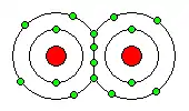 This means that atoms can come to a mutually beneficial relationship in which they share the electrons in their outer shell; this is known as a covalent bond. For example, consider the diagram to the right, showing such a bond between two oxygen atoms, with the nucleus represented in red and the electrons in green. Each atom on its own has six electrons in its outer shell, but by sharing electrons they have eight electrons apiece in their outer shells. The two atoms bonded together in this way form a molecule: in this case the molecule O2 (this chemical notation will be explained below).