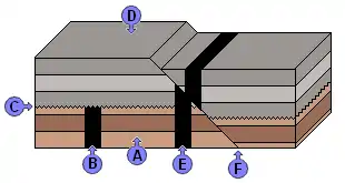 The brown sedimentary rocks (A) must be older than the dike (B) that cuts through the strata; the dike must be older than the erosional surface which truncates it (C) which is older (by the principle of superposition) than the gray sedimentary rocks (D) which overlie it; this rock must be older than the dike (E) cutting through the gray strata; and then this dike must be older than the fault which cuts through it (F).