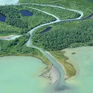 As a river discharges into a larger body of water, the current disperses and loses energy, and so the river dumps its sedimentary load: naturally, it will shed the heaviest sediments first, where the energy is highest, with progressively lighter sediments being carried further out into the sea or lake.