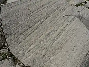 A glacier moving over a landscape will sweep up topsoil and loose rocks as it goes, transporting them towards the ablation end of the glacier and revealing the bedrock beneath. This bedrock will be polished by the passage of the ice over it; it will also be grooved and scored in the direction of travel by the rocks contained in the glacier: such grooves are known as striations or striae, and the rocks are said to be striated. The picture to the right shows an example of striation: