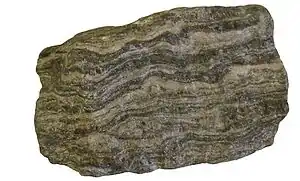 Finally, we come to gneiss. At high grades of metamorphism, sheet silicates tend to break down, and dark-colored chain silicates such as hornblende and pyroxene begin to appear. These are separated out into dark bands, again at right-angles to the direction of pressure, giving gneiss a distinctive streaky appearance, as shown in the photograph.