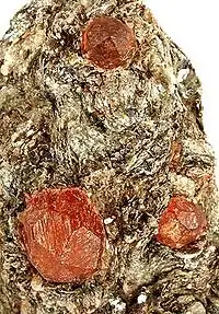 Geologists can correlate index minerals with grades of metamorphism because it is simple enough to repeat the processes of metamorphism in the laboratory; that is, they can take a piece of non-metamorphic rock, subject it to various regimes of temperature and pressure, and see which characteristic minerals form at which temperatures. So in shale, for example, we see a sequence (as temperature increases) from unaltered shale to rocks containing chlorite; then biotite; then garnet; then staurolite; then kyanite; and finally silmanite. The image to the right shows some particularly large garnets embedded in metamorphic rock.