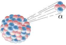 - Alpha decay. In this form of decay, the nucleus ejects an alpha particle consisting of two neutrons and two protons, reducing the atomic number by two and the atomic weight by four.