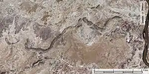 The photograph to the right shows a particularly nice example of shoestring topography. In this case, the sedimentary rocks formed from the sediment of a former river have proved more resistant to erosion than the rocks of its former floodplain, and so the former river stands clear as a ridge of sedimentary rock of different composition from that of the surrounding landscape.