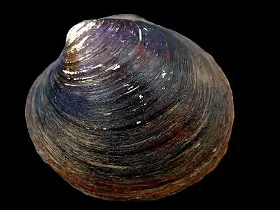 Some corals lay down distinct bands of skeletal calcium carbonate on a daily basis and also display seasonal patterns, so that they keep count both of days and of years. In the same way, mussels deposit their growth bands every low tide, but also show variations according to the phase of the moon, so that they keep count both of low tides and of lunar months. The photograph above right shows the clam Arctica islandica, a popular species with sclerochronologists: growth bands are visible in the shell.