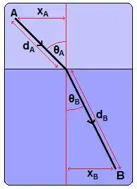 Using the principle of least time, we can say exactly how refraction should take place: a little simple mathematics tells us that the ratio of the velocity in medium A to the velocity in medium B should be equal to the ratio of sin θA to sin θB; or to put it another way, equal to the ratio of xA/dA to xB/dB. This is known as Snell's Law. Where the velocity changes smoothly and gradually through the medium, this will result in the ray taking a curved path.