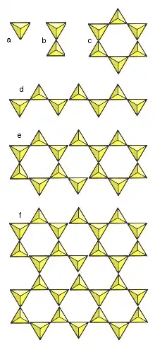 Each tetrahedron can share each one of its oxygen atoms with one other tetrahedron, so that two tetrahedra can join together corner-to-corner (but not edge-to-edge or face to face). Hence each tetrahedron can be linked with up to four other tetrahedra, one for each corner of the tetrahedron; or three, two, one, or none. This gives us a wide variety of structures that can be built out of tetrahedra: three-dimensional lattices; two dimensional sheets, chains, double chains, rings, et cetera. The diagram to the right shows some of the possible structures. Note that the chain and double chain can be extended indefinitely in one direction and the sheet in two directions.