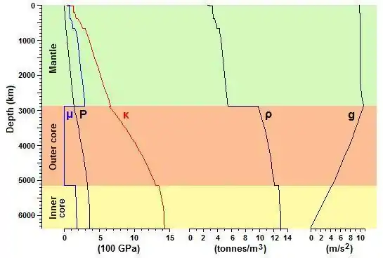 Here μ represents rigidity; κ incompressibility; P pressure; ρ density; and g the force of gravity.