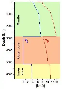 As was explained in the article on seismic waves, it is possible by studying earthquakes to discover the velocities of P- and S-waves at various points within the Earth. The results are summarized in the chart to the right.