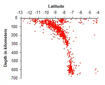 Because it is possible to measure the depth of an earthquake (see here for details) as well as its latitude and longitude, observations of earthquakes allow us to form a good picture of what happens when a slab descends into the athenosphere. The diagram to the right, for example, shows the locations of earthquakes of magnitude 4.5 or greater occurring between 1973 and 2004 where the Indo-Australian plate is subducted under the Lesser Sunda Islands. The profile of the slab is clearly traced out by the incidence of earthquakes. (The US Geological Survey's Earthquake Hazards Program has many such maps of subduction zones.)