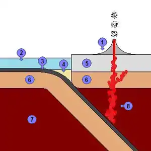 In the diagram, oceanic crust (on the left) is being subducted under continental crust (on the right). The triangular gap formed where it bends to go under the continental crust is known as a trench. For reasons that we shall discuss below, the subducted slab undergoes partial melting at a depth of about 120 km, producing volcanoes above the melting.