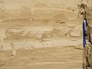 Flame structures are formed when a denser sediment, (typically sand) is deposited on top of a less dense sediment (typically mud). The difference in density forces the mud to flow upward in what are known as diapirs, producing a distinctive flame-like structure in which the "flames" are always at the top. The photograph to the right shows an unlithified example.