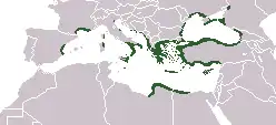 The west coast of Greece faces the Mediterranean and the east coast the Aegean. The west coast of Greece is more favourably placed for trade with Italy and Spain. The east coast of Greece offers access to the coast of Asia Minor as well as the Balkans and the Black Sea. At the southern tip of Greece is the Corinthian isthmus which acts as a land bridge to the Peloponnese peninsula. The north of Greece fans out to the borders of Albania, Macedonia and Bulgaria. Mainland Greece is divided north to south by the Pindus mountain range of which Mount Olympus is the highest peak. The Aegean islands were colonized by Greek settlers in prehistoric times and their importance is reflected in Greek mythology notably as the birthplace of major Greek deities. The two largest islands in the Aegean are Euboea and Crete.