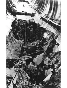 The first big part of the project was to divert the Colorado river around the construction site. The design of the dam included four 50-foot in diameter diversion tunnels drilled directly into the canyon wall and were used to divert the entire flow of the Colorado River, while the dam was being built. Following completion of the dam, two of the tunnels were used as spillways and the other two as paths to the powerhouse.