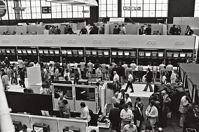 Atari at CES 1982. A line of CRT displays show Atari games to onlookers.