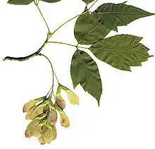 Acer negundo is a species of maple (Acer) that grows throughout much of North America. It is called Manitoba Maple in Canada, and Ash-leaved Maple (also Ashleaf Maple, Ash Maple) or Box Elder (also Boxelder, California Boxelder, Western Boxelder, Inland Boxelder, Boxelder Maple) in the United States. The American common names come from the pinnately compound leaves of Acer negundo that are similar to those on the elder (Sambucus) and some species of ash (Fraxinus). The "box" in the name is thought to be because this maple's wood superficially resembles that of the box hedge (Buxus sempervirens). Additional common names include Cut-leaved Maple (because of the compound, or fully dissected, leaves), or Three-leaved Maple (because all new leaves from overwintering buds have 3 leaflets), or Sugar Ash (because the leaves resemble the ash, but it is a source of maple syrup). Its numerous and diverse common names attest to its familiarity to many peoples over a great geographic range.