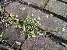 Hairy bittercress, Cardamine hirsuta, is a winter annual plant native to Europe and Asia, but also present in North America as an invasive weed. The plant is a member of the mustard family (Brassicaceae), and is edible as a bitter herb. Other common or country names include bittercress, land-cress and lamb's cress.
